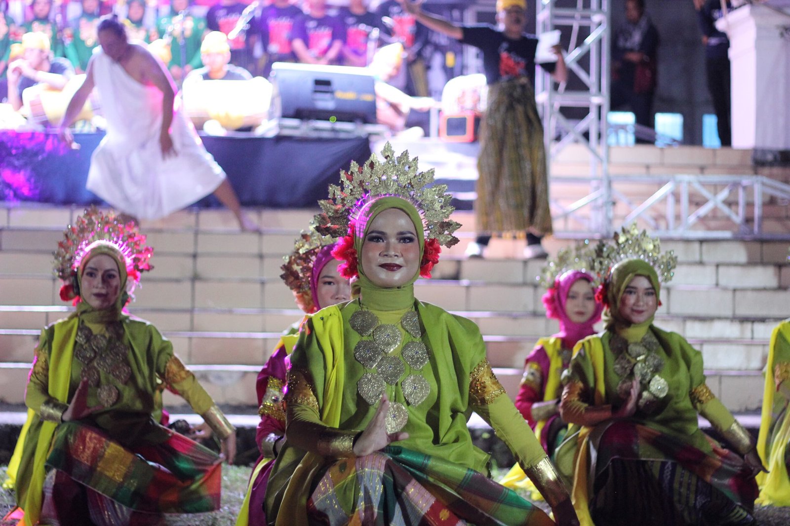 Tarian tersebut dibawakan oleh penari perempuan penerus Wija To Luwu, menghadirkan kolaborasi lintas bidang seni dalam satu kesatuan pertunjukan budaya.