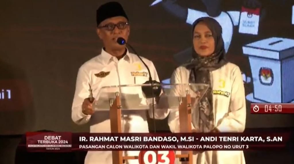 Calon wali kota dan wakil wali kota Palopo Rahmat Masri Bandaso-Andi Tenri Karta saat memaparkan visi misi dalam debat Pilwalkot Palopo di Hotel Gammara, Kota Makassar, Sulawesi Selatan, Minggu 3 November 2024. (ist)