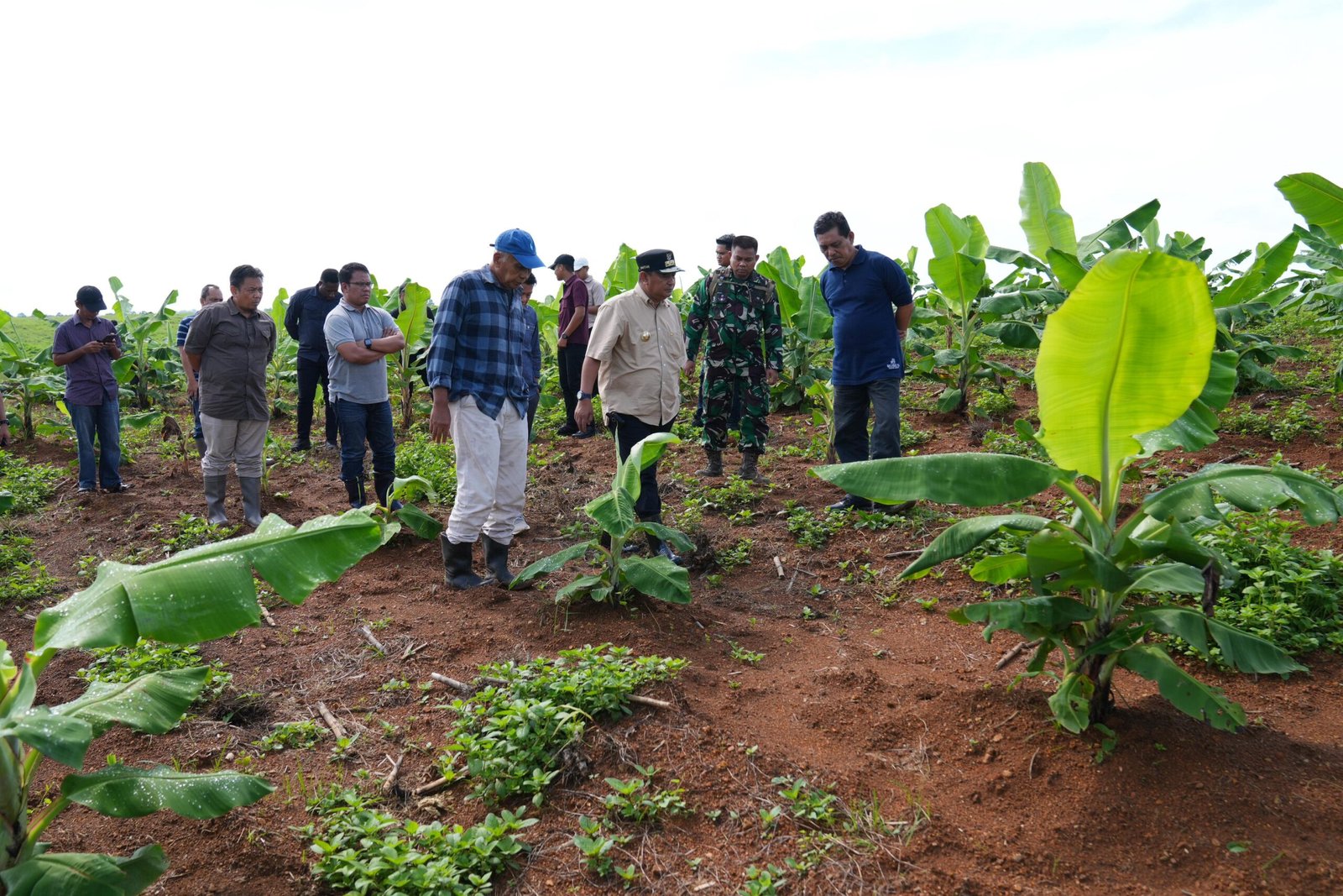 BONE, TEKAPE.co – Penjabat Gubernur Sulsel Bahtiar Baharuddin bersama perwakilan PT Perkebunan Nusantara (PTPN) melakukan peninjauan pisang cavendish yang sudah berumur empat bulan di Kecamatan Mare, Kabupaten Bone, Sabtu, 17 Februari 2024.