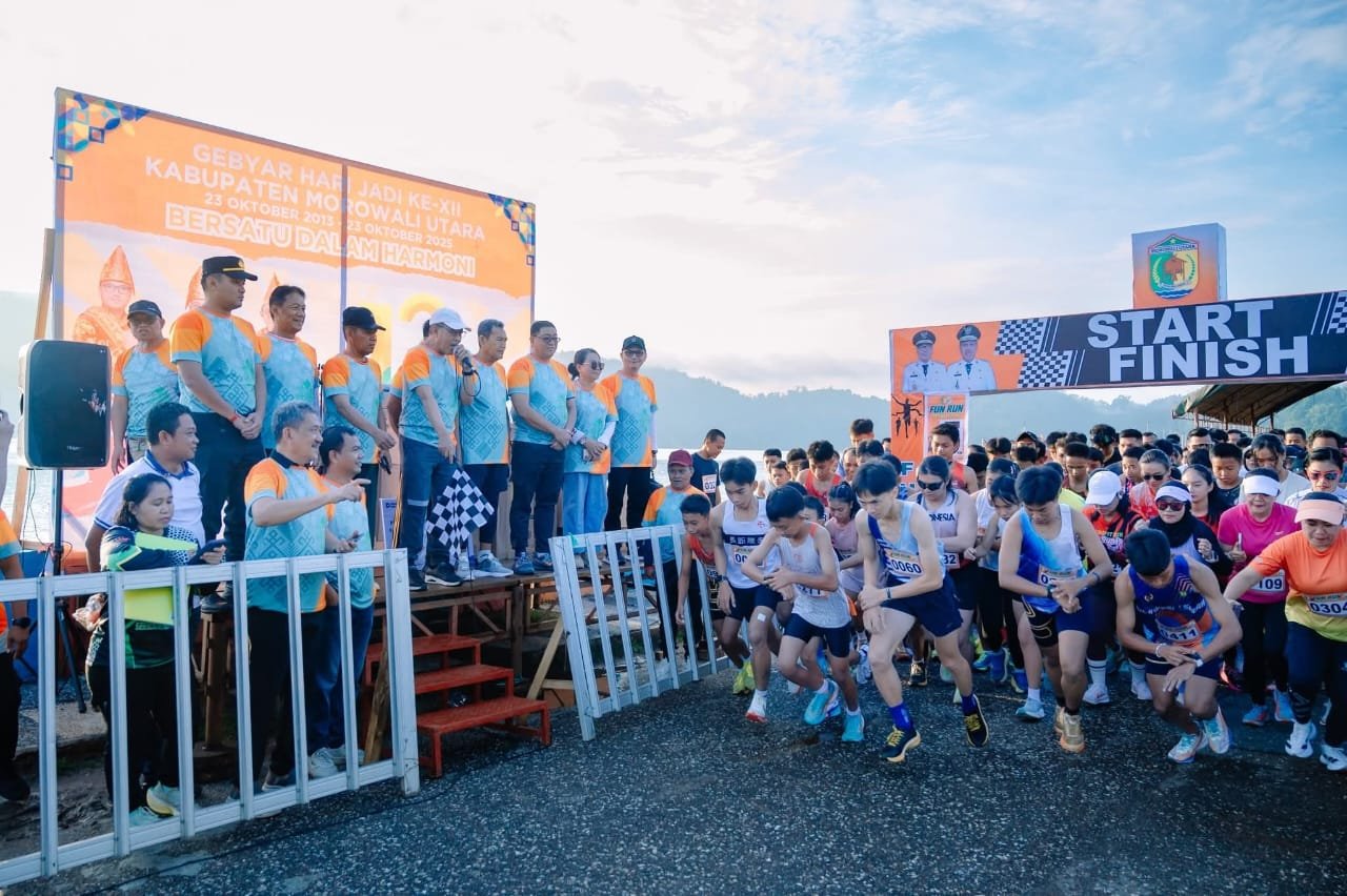 KOLONODALE, TEKAPE.co – Peringatan Hari Ulang Tahun (HUT) ke-12 Kabupaten Morowali Utara (Morut) dimeriahkan dengan kegiatan olahraga Fun Run yang berlangsung semarak di tanggul pelangi Kolonodale, Jumat (24/10/2025) pagi.