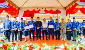 MORUT, TEKAPE.co – Pengurus Dewan Pimpinan Daerah (DPD) Partai Nasdem Morowali Utara (Morut), bersama bakal calegnya menggunakan atribut topi adat dari berbagai daerah, saat menyerahkan dokumen pendaftaran, di Kantor KPUD Morut, Kamis 11 Mei 2023.