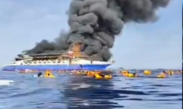 Dalam siaran langsung yang dibagikan akun Facebook Abdurahman Agu, tampak penumpang mengapung di laut dengan kapal terbakar di belakang mereka.