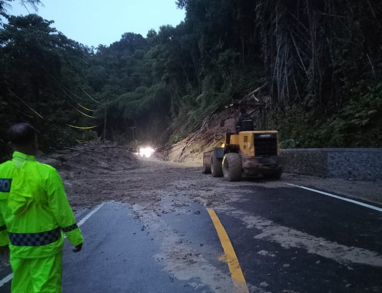 Longsor sepanjang 30 meter itu membawa material berupa tanah dan batang pohon yang menutupi seluruh badan jalan, menyebabkan arus lalu lintas lumpuh total.