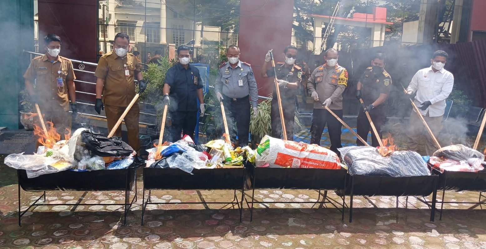 Termasuk ikut dimusnahkan dengan cara dibakar barang bukti kosmetik ilegal tanpa izin BPOM dan rokok illegal.