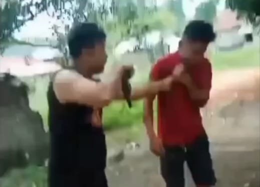 Ia terlihat marah-marah, sambil memegang pistol, memegang kerah baju seorang pemuda dan menunjuk ke arah warga merekamnya.