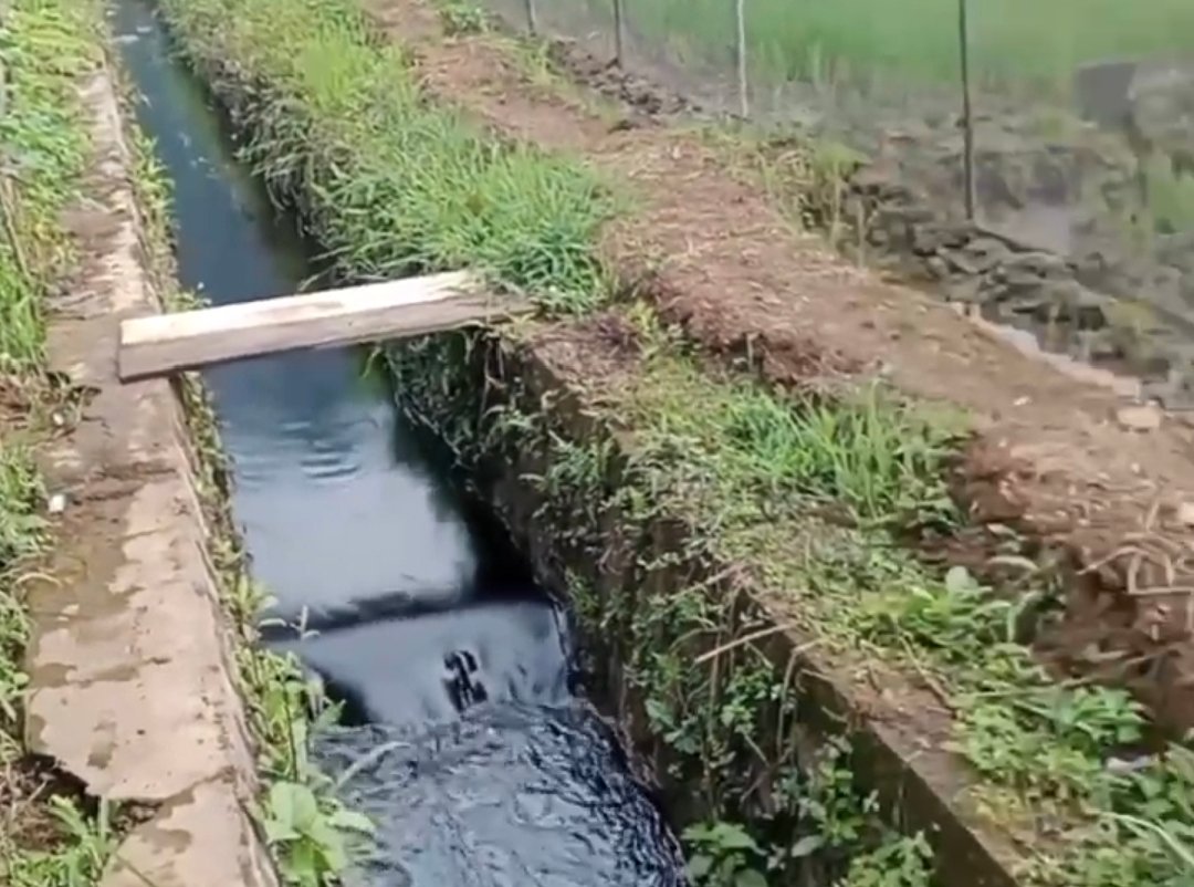 Informasi warga di lokasi, aroma minyak menyengat menusuk hidung begitu mendekati aliran irigasi. Permukaan air yang biasanya jernih kini dipenuhi lapisan hitam pekat mirip oli kotor, memantulkan kilau keperakan saat terkena cahaya matahari.