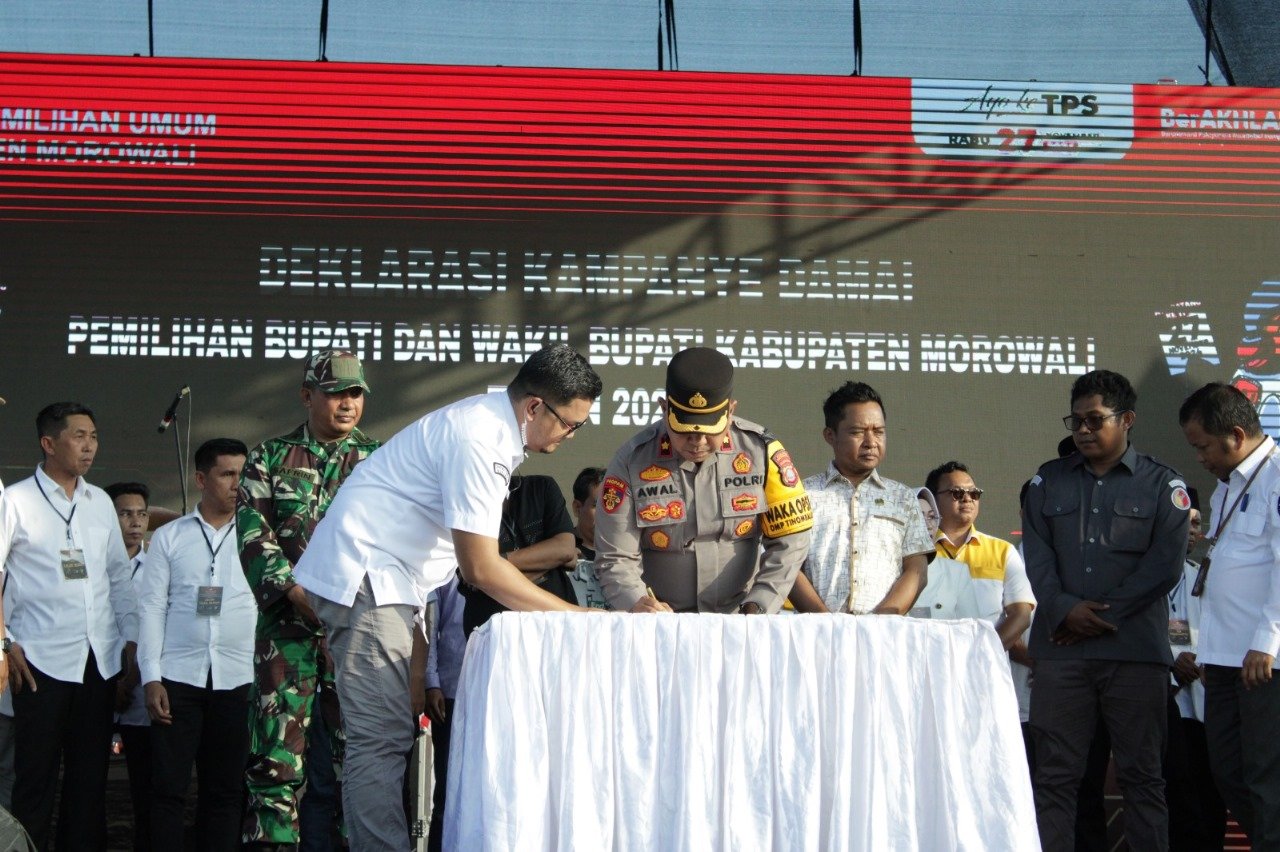 Deklarasi kampanye damai bersama pasangan calon (paslon) bupati dan wakil bupati Morowali dilaksanakan di Lapangan Sangiang Kinambuka, Morowali, Senin 23 September 2024.